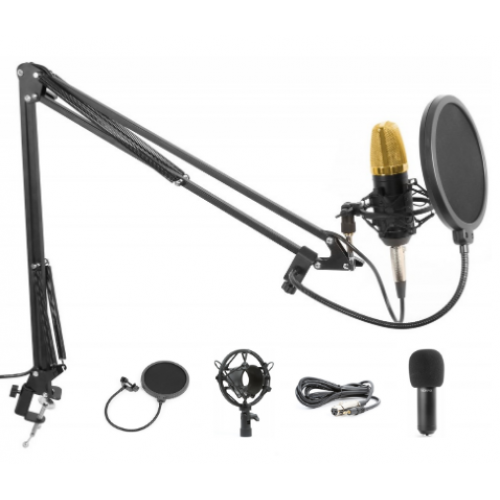 Este conjunto para estudio incorpora tudo o que necessita para uma gravação profissional. O microfone de condensador com o seu escudo para-ventos, assegura uma gravação pura sem ruidos de respiração. Com este microfone pode emitir em directo em canais tipo YouTube sem nenhuma limitação. O suporte ajusta-se a comprimentos e ângulos. Este set de estudio é imprescindivel em apresentações, musicos, vocalistas.